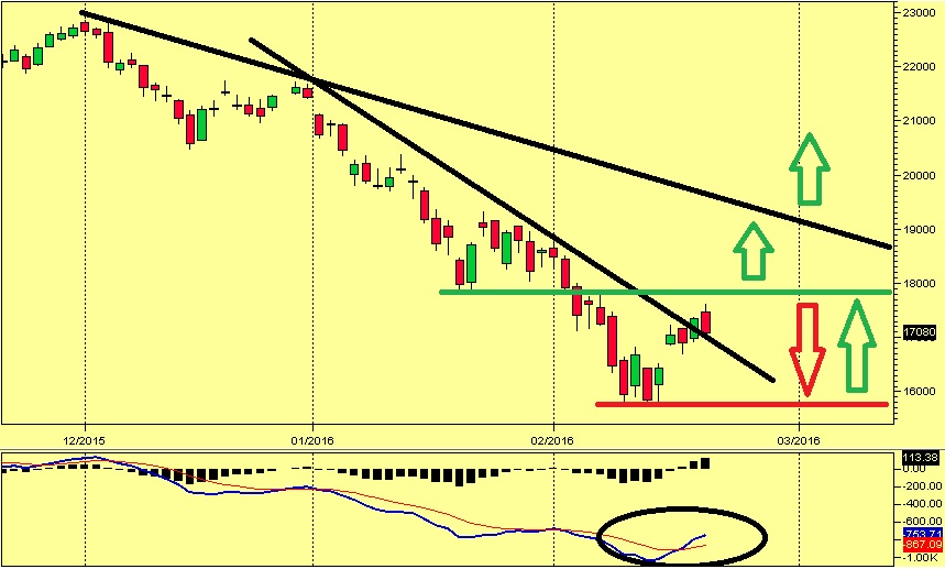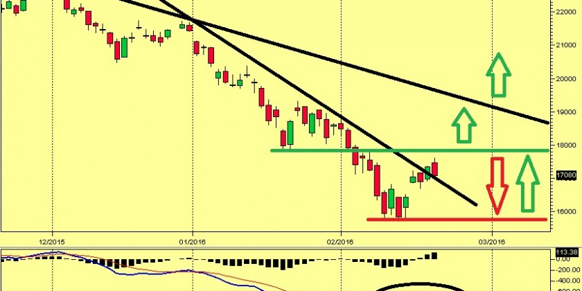Dal punto di vista tecnico, comunque, sembra che il già citato livello 15.765 possa rappresentare un minimo molto importante. Per ben 4 sedute consecutive (dal 9 al 12 febbraio) si è creata una fase di accumulo che ha permesso ai prezzi di rimbalzare velocemente e recuperare circa 1.800 punti in meno di una settimana, in concomitanza con la rottura rialzista della trendline discendente più inclinata.