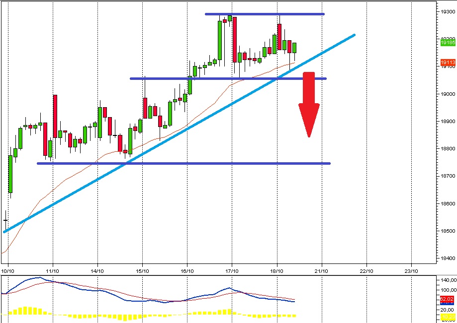 E’ più probabile, invece, uno storno dei prezzi alla violazione del livello 19.055 con obiettivo il ritorno verso il supporto a 18.750.