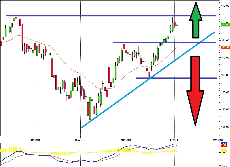 Pertanto, dal punto di vista operativo, non è escluso un ulteriore stappo rialzista dell’obbligazionario tedesco fino alla soglia dei 143 punti, ma bisognerà valutarlo attentamente in quanto potrebbe trattarsi di un falso segnale. Di sicuro, comunque, al momento il mercato non è negativo e non dovranno essere aperte posizioni short o di copertura prima della violazione del livello 138,78.