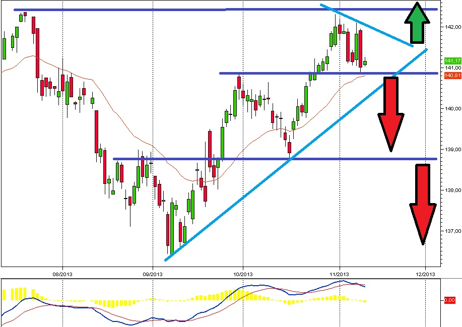 Dal mese di settembre, comunque, il mercato rimane decisamente impostato al rialzo grazie alla realizzazione di una serie di massimi e minimi sempre crescenti, e sembrava avere la forza per raggiungere l’area intorno a 142,35, corrispondente al precedente top di luglio. In realtà, nelle recenti sedute, è prevalsa una generalizzata debolezza che ha riportato i prezzi sull’importante supporto di 140,87, molto vicino anche alla media mobile a 25 daily.