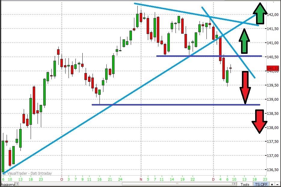 Dal punto di vista operativo, pertanto, si è ancora in tempo per aprire posizioni short in quanto l’attuale movimento discendente dell’obbligazionario tedesco potrebbe continuare fin sotto quota 138,79. Per le posizioni rialziste, invece, è consigliabile attendere almeno il ritorno sopra l’area 141.