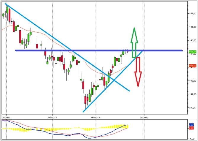 Però, è anche vero che al momento i prezzi si trovano proprio a ridosso dell’area di resistenza 144,18/144,38, per cui a breve potrebbe essere prevedibile un leggero ritracciamento.