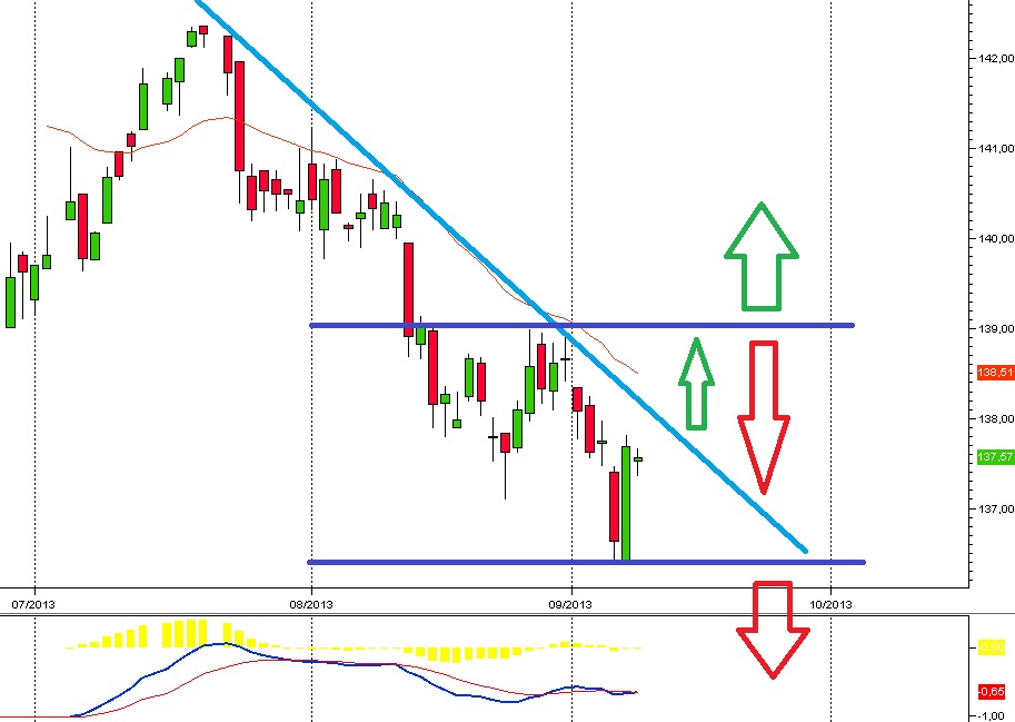 Indipendentemente dalla volatilità che sta caratterizzando il mercato azionario internazionale, le quotazioni del BUND rimangono decisamente impostate al ribasso. Infatti, si trovano ben al di sotto sia della trendline discendente tracciabile dal massimo dello scorso luglio a quota 142,37 che della propria media mobile a 25 daily. Nel breve termine è possibile ipotizzare un rimbalzo fino alla resistenza posta in area 139 punti, superata la quale si potrebbe assistere ad una improbabile inversione di tendenza. Altrimenti, è più facile prevedere l’estensione di questa attuale fase di lateralità, per poi attendersi la continuazione del trend ribassista in un’ottica di medio/lungo periodo: il primo target individuabile si trova sul supporto di 135,30 (minimo relativo del marzo 2012), mentre quello successivo è costituito dal triplo minimo realizzato nell’autunno del 2011 in area 133.