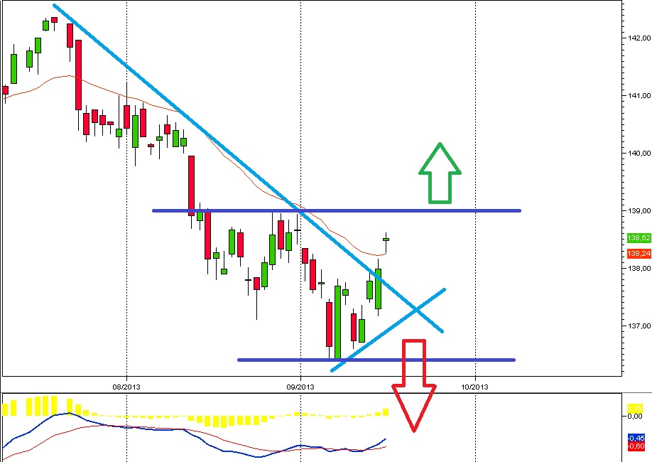 Anche la trendline ribassista di medio periodo tracciabile dal massimo dello scorso luglio a quota 142,37 è stata superata al rialzo, ma sarà solo la rottura della resistenza statica sul livello 139 a confermare la positività del mercato.