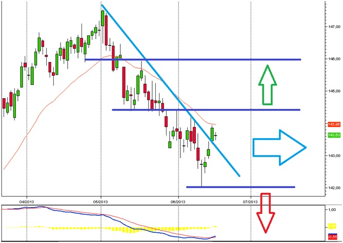 Molto più probabile, invece, è il mantenimento dei prezzi all’interno di un ampio trading range compreso proprio tra i livelli 144,38 e 142,02. Sotto quest’ultimo prezzo, la discesa potrebbe continuare fino a 140,26.