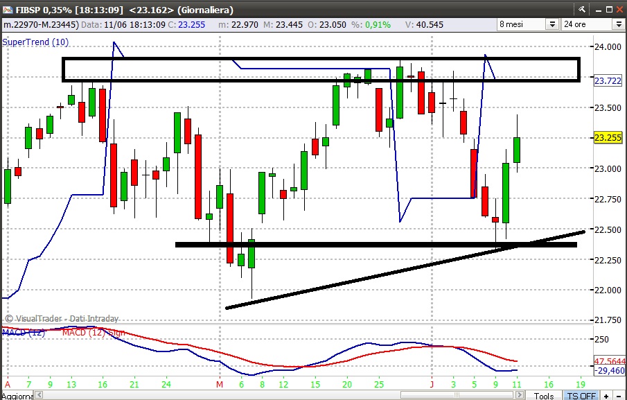 Pur rimanendo impostato al rialzo nel lungo periodo, il mercato azionario italiano comincia a mostrare alcuni segni di cedimento nel medio termine. Osservando un grafico daily del Future FTSE/MIB, infatti, risulta evidente come le quotazioni siano notevolmente salite da inizio anno, ma da più di due mesi si stiano muovendo solo all’interno di un ampio canale laterale. Dopo i massimi realizzati a metà aprile a quota 23.715, i prezzi hanno subito uno storno fisiologico fino a toccare il livello 21.930, corrispondente con precisione al ritracciamento minimo di Fibonacci, pari al 23,6%. Con notevole forza, poi, i prezzi hanno ripreso la propria corsa al rialzo e con una configurazione a V hanno superato la precedente resistenza fino a realizzare un nuovo massimo sul livello 23.895.
