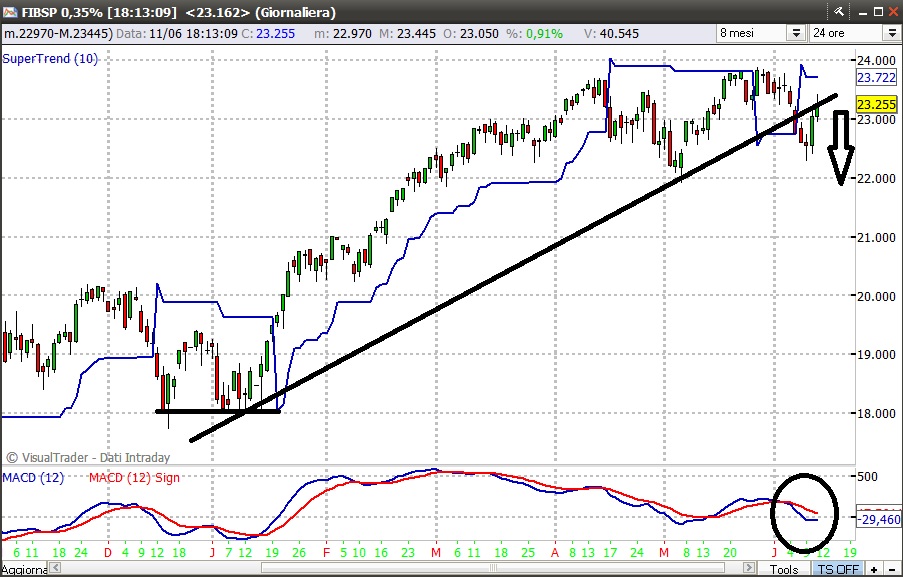Dal punto di vista operativo, pertanto, è consigliabile molta prudenza nelle prossime settimane, anche a causa della volatilità in aumento. Di sicuro non è il momento per aprire posizioni long mentre potrebbero essere più profittevoli le posizioni ribassiste. Il FTSE/MIB, infatti, ha violato al ribasso la trendline rialzista di lungo periodo e sta effettuando il consueto pullback. Inoltre, sia l’indicatore Supertrend che il Macd forniscono chiari segnali negativi.