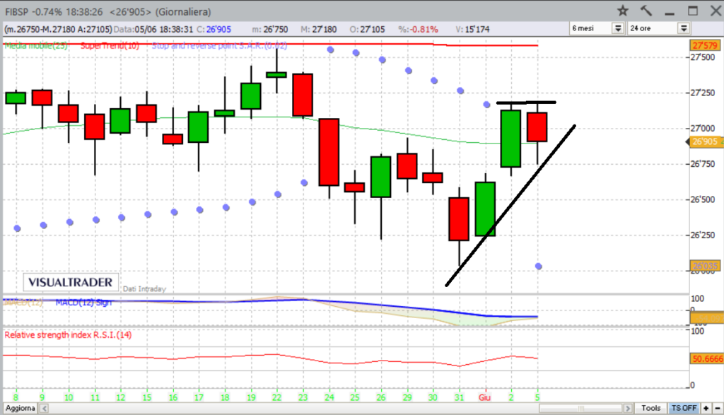 E’ vero che tra venerdì e ieri si è creata una figura di doppio massimo in area 27.170 (che presume un respingimento dei corsi), ma tale movimento, comunque, non inficia sul trend rialzista di fondo del mercato che sta lavorando la soglia dei 27.000 e sta (lentamente) preparando un avvicinamento alla resistenza più importante, ossia quella presente sul livello 27.600.