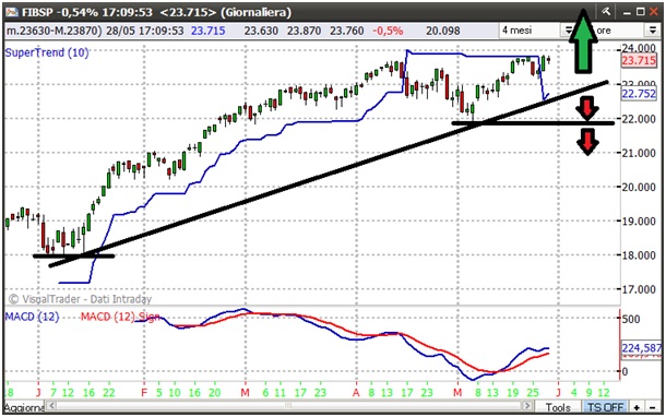 Piazza affari sembra inarrestabile dopo aver superato indenne un ritracciamento e realizzato nuovi massimi. Solo oltre il livello 23.900 la corsa continuerà fino a 24.500. Il primo supporto si trova in area 22.800.