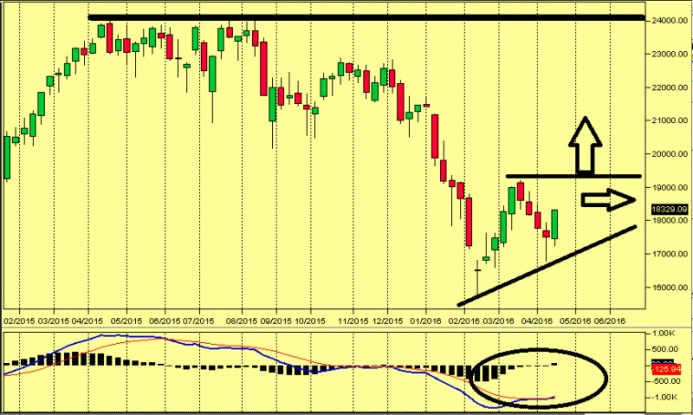 A parte le consuete fasi di lateralità più o meno prolungate, non crediamo ci possano essere altri possibili scenari, a meno che non venga violato al ribasso il supporto di 16.780, a causa del referendum sulla Brexit o della continua incertezza sul sistema bancario italiano.