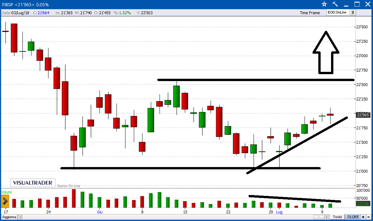 Il mercato azionario italiano sta attraversando una fase di lateralità piuttosto accentuata nel medio periodo. Dalla fine del mese di maggio, infatti, l’indice FTSEMIB sta oscillando in un trading range compreso tra il livello 21.000, dove si è realizzato un triplo minimo, e l’area intorno ai 22.500 punti.