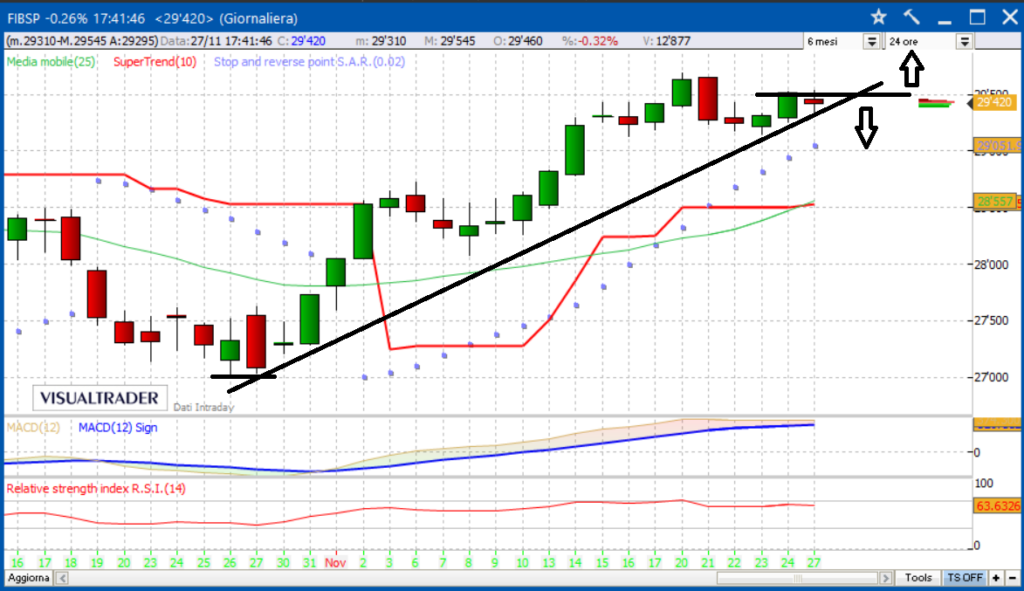 Tale movimento intraday ha permesso al Fib di creare un pattern di analisi candlestick assimilabile al “Doji”, indicante una generalizzata indecisione da parte degli operatori. Situazione che è coerente con l’attuale struttura grafica del mercato che sta correndo molto a partire dal (doppio) minimo toccato a fine ottobre in area 27.000. La positività non è in discussione e, a parte qualche fisiologica presa di beneficio, il mercato italiano è senza dubbio indirizzato verso l’obiettivo più importante, ossia i massimi annuali (toccati a luglio) nell’intorno dei 30.000 punti.