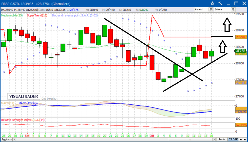 Dopo il massimo toccato lo scorso 20 settembre sul livello 29.355 l’indice è violentemente sceso fino al minimo del 4 ottobre a quota 27.160. Da quel momento vi è stata una rapida ripresa, pur con qualche giornata negativa, che sembra solida visto l’avvicinamento alla resistenza presente sul livello 28.500. Questo è lo spartiacque tra positività e negatività del mercato, che una volta superato porterà i corsi con altrettanta velocità verso quota 29.000. L’unica criticità riguarda il giudizio che verrà espresso da Standard&Poor’s in merito al rating del nostro paese. Certo, riguarderà più l’obbligazionario che l’azionario, ma oramai i mercati sono sempre più correlati e, in caso negativo, potrebbero esserci contraccolpi. Comunque, riassumendo, il rialzo dovrebbe continuare almeno fino a giovedì.