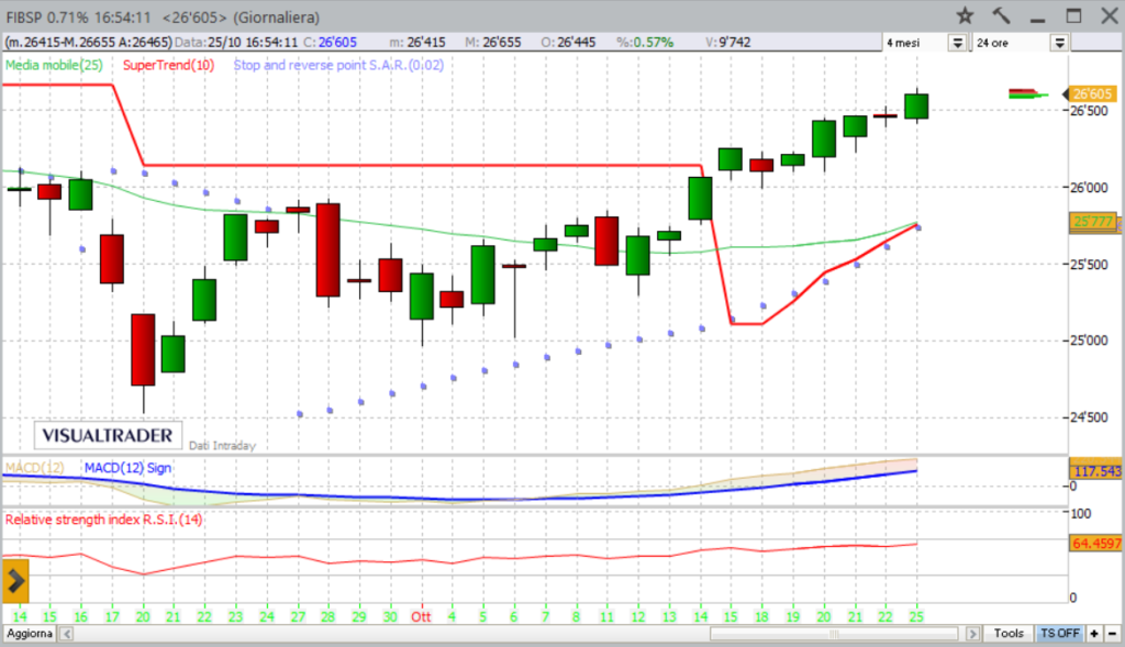 A Piazza Affari, quindi, sembra prevalere l’ottimismo. L’impostazione grafica, infatti, vede i prezzi stazionare al di sopra dell’indicatore Supertrend mentre sia l’indicatore Parabolic Sar che la media mobile a 25 sono diventati rialzisti da poco. Anche l’indicatore Macd ha appena incrociato il proprio Signal. Inoltre, è da segnalare come l’indicatore RSI sia posizionato nell’area di “neutralità” vicino al livello 65.