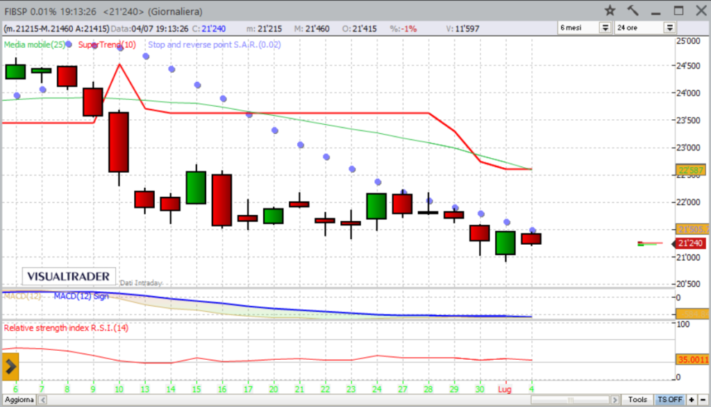 A Piazza Affari, quindi, sembra prevalere un generalizzato pessimismo. L’impostazione grafica, infatti, vede i prezzi stazionare ancora al di sotto dell’indicatore Supertrend, mentre sia la media mobile a 25 che l’indicatore Parabolic Sar sono diventati negativi da inizio giugno. Anche l’indicatore Macd ha appena incrociato il proprio Signal. Inoltre, è da segnalare come l’indicatore RSI sia posizionato nell’area di “neutralità” vicino al livello 35.