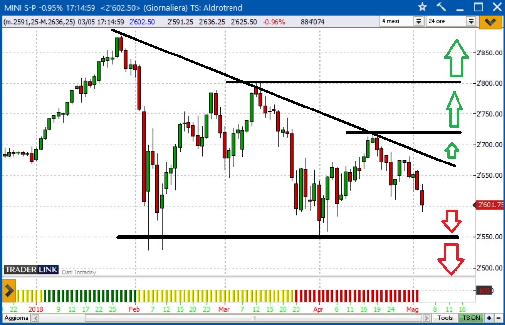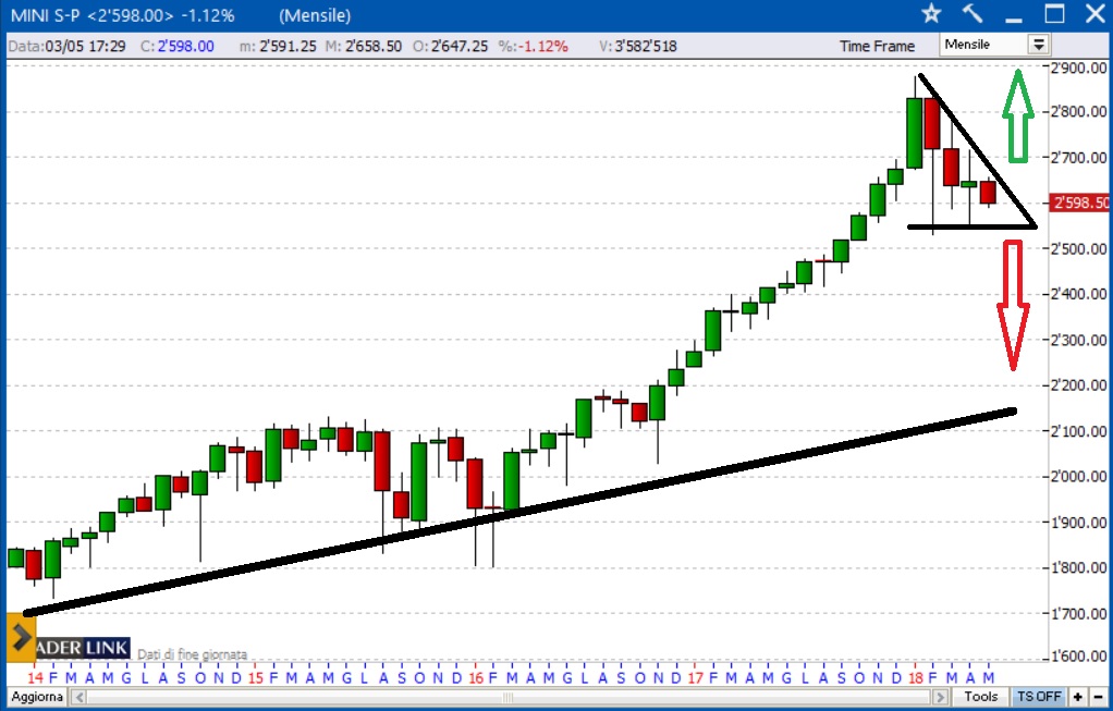 Il mercato americano è decisamente impostato al ribasso nel medio termine. Il massimo storico registrato dal Future S&P500 lo scorso gennaio sul livello 2.878 è oramai un lontano ricordo e, da allora, le quotazioni hanno sempre e solo realizzato massimi relativi decrescenti tali da poter tracciare una trendline negativa piuttosto solida. E’ anche vero che le violente fasi di sell off avvenute nei mesi di febbraio e marzo hanno trovato sempre lo stesso ostacolo in prossimità del supporto posto a 2.550 punti, tant’è che la configurazione grafica appena descritta può assomigliare ad un “triangolo” posto nella fase finale di un lunghissimo trend rialzista cominciato più di sei anni fa.