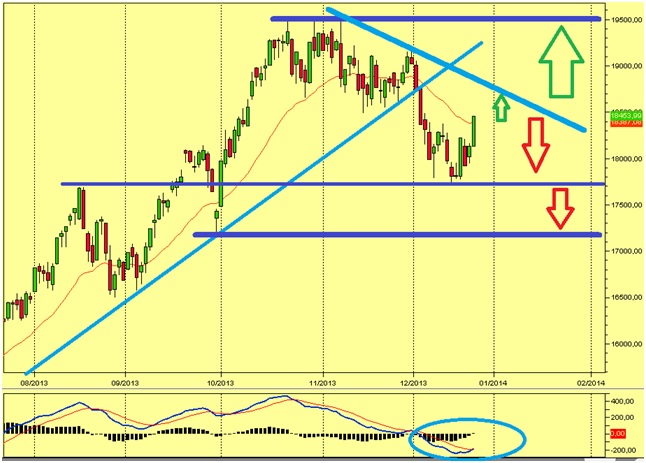 In realtà, l’analisi del mercato ci impone ancora molta prudenza. Il recentissimo scatto dell’indice, infatti, è dovuto contemporaneamente a due fattori: il primo, riguarda il fatto che nella seduta del 12 dicembre il FTSE/MIB si sia appoggiato sull’evidente supporto posto a quota 17.750; il secondo, che le decisioni in materia di politica economica da parte della Fed, annunciate mercoledì scorso, siano state precise e ben accolte dal mercato (Tapering).